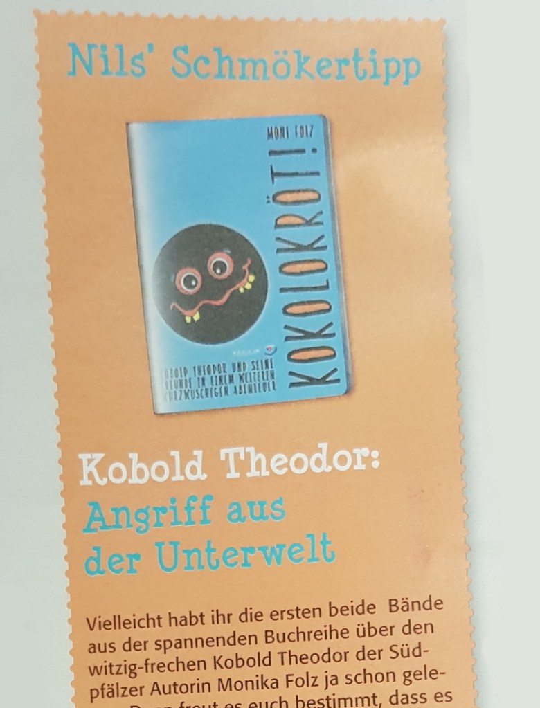 Moni Folz hat schon 3 Bücher geschrieben, die alle mit …kröt! zu tun haben. PAPPERLAKRÖT! und VERMALEKRÖT! und KOKOLOKRÖT!, aber ja! Es ist also eine Buchreihe. Da ist der Kobold Theodor, eigentlich wohnhaft in Untenwelt, der sich aber gegen böse Mächte zur Wehr setzen muss und deshalb in die Obenwelt gelangt und Kontakt zu den Menschen bekommt. Da wäre zum Beispiel Theresa, die Schülerin. Es gibt eine Menge Verwicklungen in alledem, seltsame Gestalten, uns unbekannte Tiere. Man denke an ein Flederschwein oder den Ipmul. Moni Folz schreibt voller Phantasie und mit vielen Ideen. Abenteuer, aber eben auch Freundschaft, darum geht es immer. Die Nils-Nager-Clubzeitung, herausgegeben von der Rheinpfalz, hat in der Frühjahrsausgabe einen Tipp zu dem BAND 3 veröffentlicht.