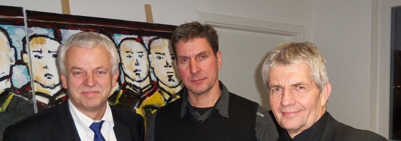 KUUUK-Autor Paul Brauhnert (Mitte) zusammen mit Roland Jahn, Bürgerrechtler und Leiter der Stasiunterlagenbehörde BStU, und dem Bürgermeister von Schwedt, Jürgen Polzehl, am 15.11.2012 in Schwedt/Oder. Im Hintergrund ein von Brauhnert konzipiertes Bild.