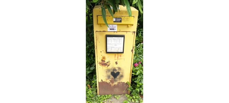 Und jetzt folgt noch unten, etwas kleiner, ein aktiver (!!!) Briefkasten in Köln-Rodenkirchen, hier: Michaelshoven, im Juni 2024, Aufnahme KUUUK Verlag.