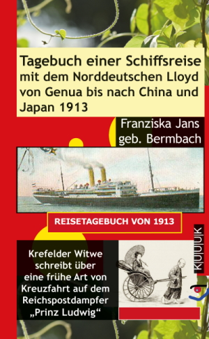 Tagebuch einer Schiffsreise 1913 mit dem Norddeutschen Lloyd auf dem Dampfschiff (Reichspostdampfer, kurz RPD, kurz auch R.-D., Passagierschiff und zugleich irgendwie auch eine Art von einem damaligen Kreuzfahrtschiff) „Prinz Ludwig“ bis nach China und Japan, via Genua, Neapel, Mittelmeer, Port Said, Suez (Port Tawfiq), Suez-Kanal, Aden, Colombo, Penang, Singapur, Hongkong, Shanghai, Tsingtau, Kobe/Hyogo, Yokohama, von dort per Landweg z. B. nach Tokio, Myanoshita, Ojigoku, Atami, Kamakura, Nikko, Kyoto, Nara, Kobe, wieder Tsingtau, von dort nach Tsinanfu, Tientsin, Peking, (von) dort (ausgehend) Himmelstempel, große Mauer, Trommelturm, Gelber Tempel, Sommerpalast, und, und, und … Minggräber, wieder Tientsin, Schiff, und wieder nach Tsingtau, usw. usf. … usw. usf. Es folgten also auch noch etliche Reiseteile im Land, sowohl in Japan als auch in China. Mit dem Zug und auch über die Berge, getragen auf Sänften bzw. Tragesesseln. Zusätzlich gab es Ausflüge an den Schiffs-Anlande-Orten der Linienfahrt des Schiffes „Prinz Ludwig“.